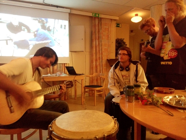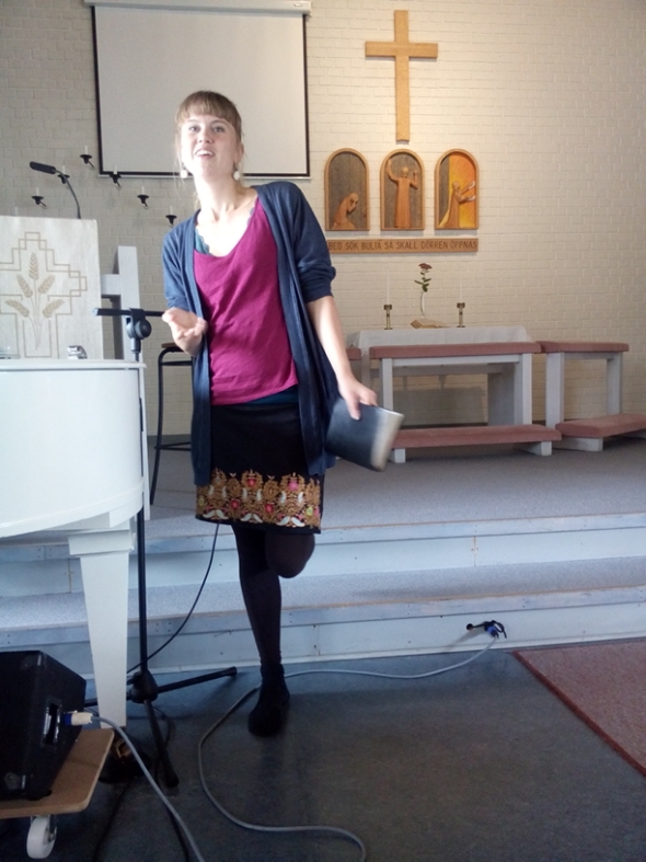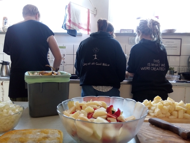 Jag har mycket att göra och hinner inte ge så detaljerad bild av allt som händer här än, men kortfattat så äter vi god dumpstrad, vegetarisk mat som vi lagar gemensamt, kör lovsångsjam med ett tiotal instrument, talar om  Pannkakskyrkans tre ben – berätta, betjäna och be – lyssnar på när Sirak snackar om Andens gåvor och vittnar om mirakler han har sett i Afrika, när Frida talar om Guds kärlek, när Alice kör bibelstudium om aktivism eller när jag berättar om Jesus Army och deras  egendomsgemenskap i  Storbritannien.