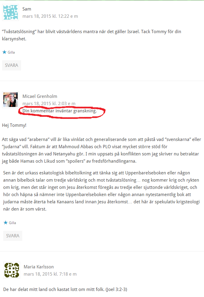 Tommy Dahlman – och flera andra kristna syskon som jag sett kommentera det israeliska valet – är dock inte så bekymrad över att fredsprocessen är låst. ”Jerusalem är enligt den Israelvänliga teologin ‘lyftesstenen’ som kommer att orsaka det tredje världskriget, därefter kommer domen. Någon tvåstatslösning ingår inte i dessa profetiska vyer.” Jippie, det kommer bli ett tredje världkrig, screw you tvåstatslösning! Sen att Bibeln inte nämner vare sig tredje världskrig eller tvåstatslösning spelar ju mindre roll. Jag påpekade detta för Dahlman, men min kommentar publicerades inte: