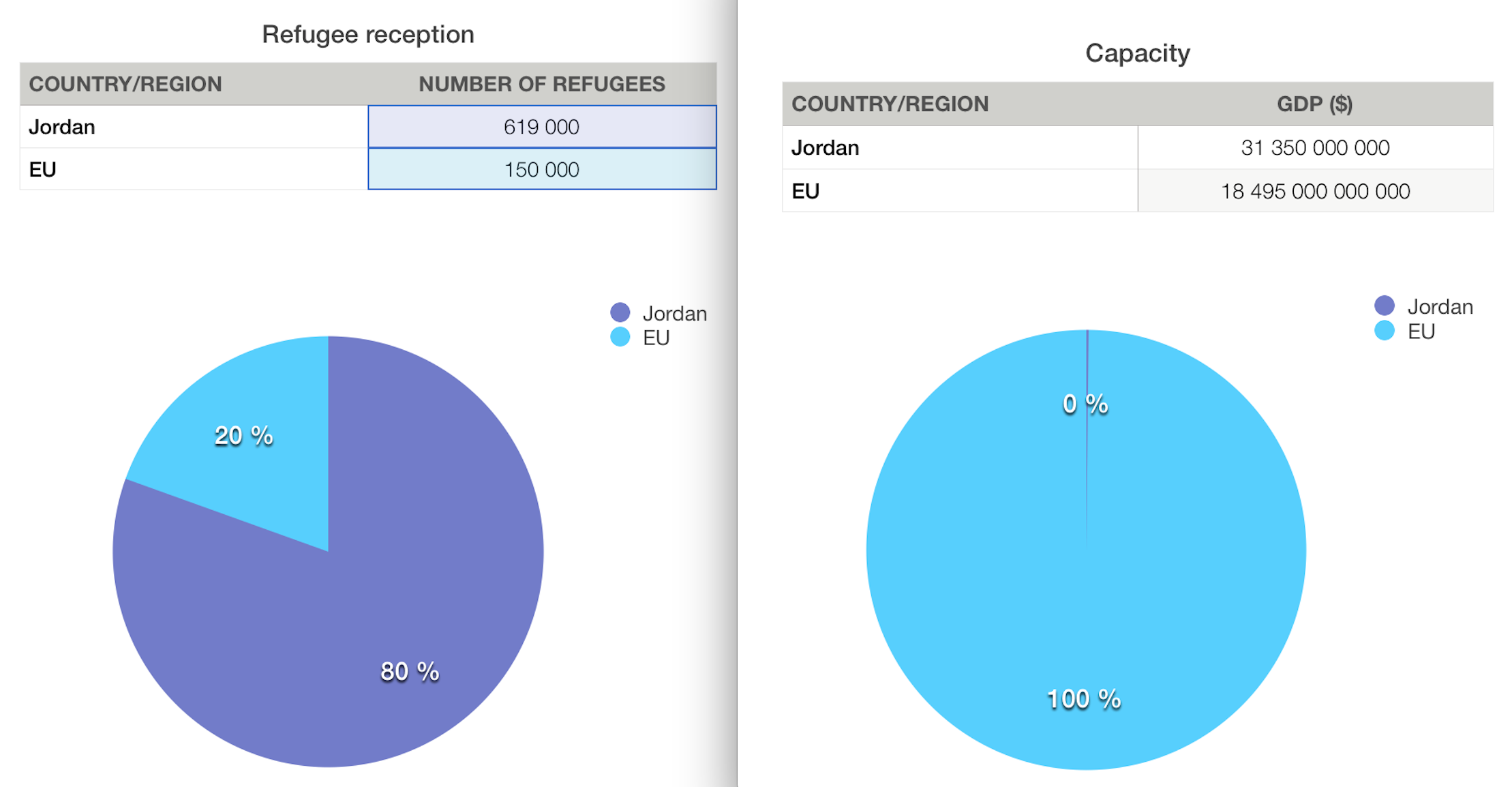 Dahlberg och de flesta andra invandringsfientliga debattörer vet att Sverige är ett otroligt rikt land och att Europa är en otroligt rik kontinent. Det är basic grundskolekunskap. Ändå ljuger de om att Sverige och Europa inte skulle ha kapacitet och resurser att ta emot flyktingar. Vilka har det då, Jordanien och Pakistan? Här är Jordanien utbryten ur grafen ovan, jämförd med EU: