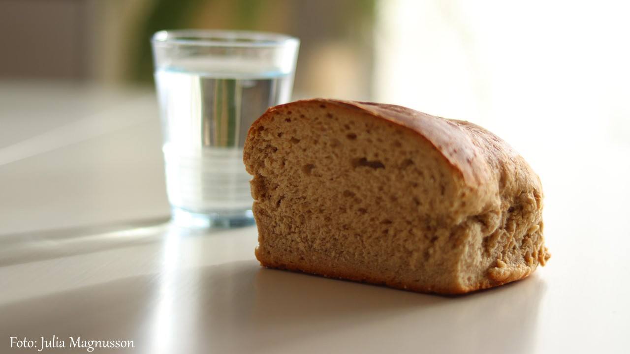 Jag behöver aldrig igen springa runt i köket, dödshungrig och leta efter något som går att äta, för Han har redan en måltid som är redo. En fin brödlimpa och ett stort glas med det levande vattnet, fritt för mig att äta när som helst. Inte bara när jag är hungrig, utan det räcker med att jag bara är lite sugen. Sugen på mer av Honom. Och det är bara att jag tar för mig.