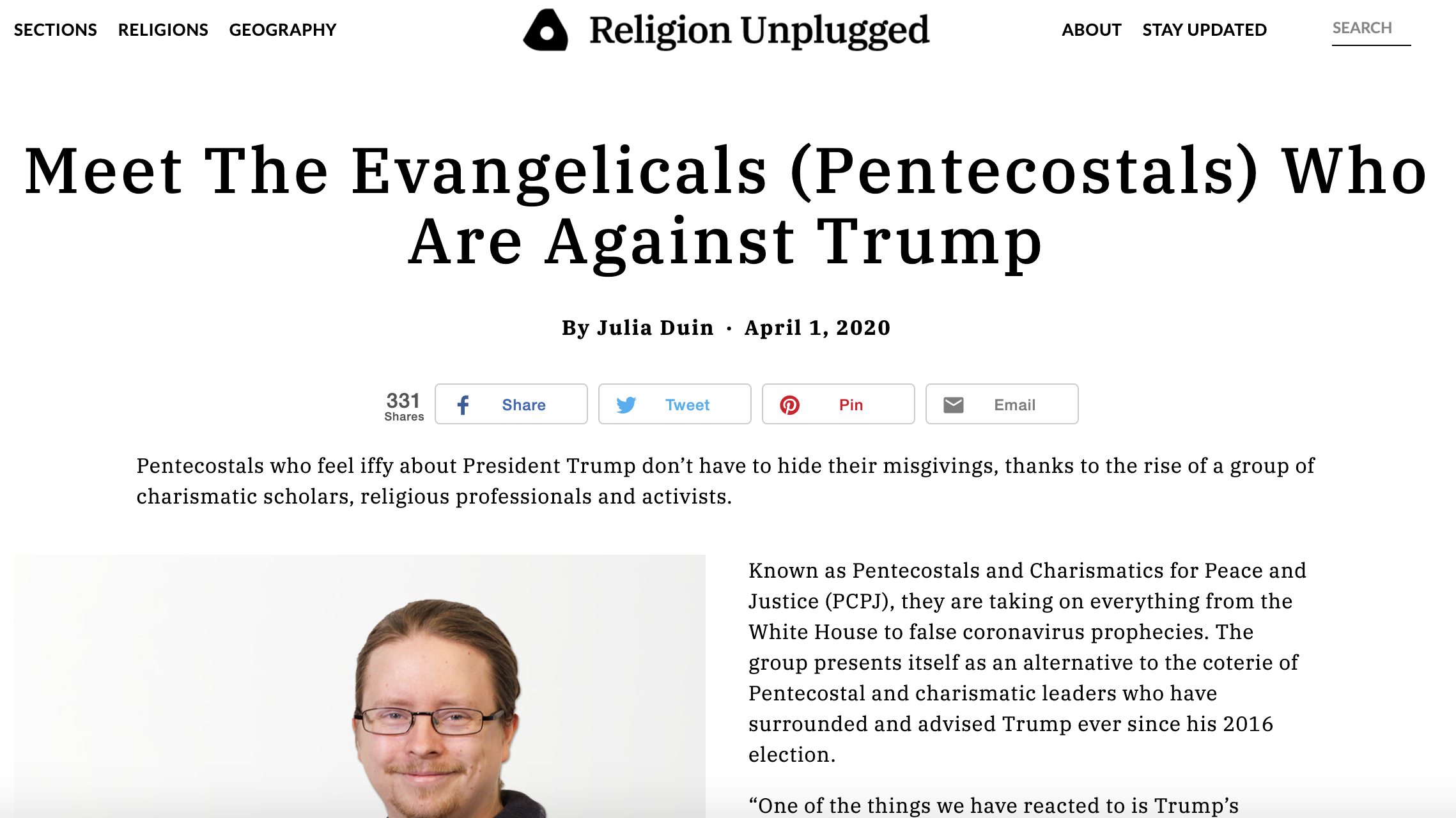 Nättidningen Religion Unplugged uppmärksammar den här veckan Pentecostals & Charismatics for Peace & Justice (PCPJ) och intervjuar bland annat mig. Väldigt många amerikanska pingstvänner är passionerade Trumpangängare och argumenterar för saker som: