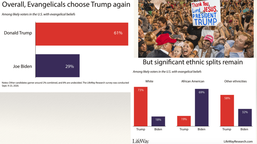 En sak vi direkt måste ha klart för oss är att det inte är så som ofta felaktigt rapporteras att 81 % av USA:s kristna stödjer Trump, eller ens att 81 % av evangelikala kristna gör det.