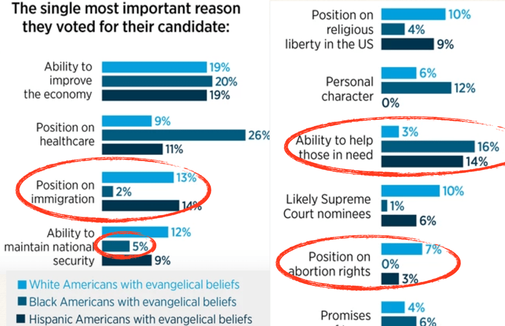 Denna undersökning gjordes efter valet 2016 och visar att för svarta evangelikala är hjälp till nödlidande en av de viktigaste valfrågorna – men en av de minst viktiga för vita evangelikala. Vita evangelikala intresserade sig stort för invandringsfrågan (i bemärkelsen att inte ta emot flyktingar, mer om det nedan) och nationell säkerhet, något svarta evangelikala inte fann lika viktigt. Svarta evangelikala hade inte heller något engagemang i abortfrågan, även fast de flesta av dem är pro-life.
