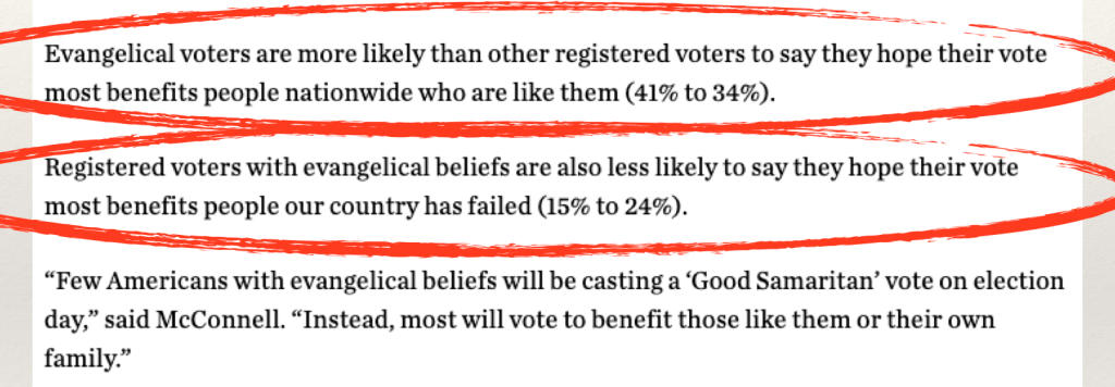 Ytterligare en undersökning från i år visar att vita evangelikala röstar till förmån för människor som är lika dem själva i större utsträckning än resten av befolkningen, medan de röstar till förmån för de mest utsatta i mindre utsträckning. Det kan förklara varför inte vita evangelikala är mer upprörda för att Trump har dragit ned på bidragen till de fattigaste och varför vita evangelikala är den väljargrupp som i högst grad anser att invandrade barn från Latinamerika ska separeras från sina föräldrar.