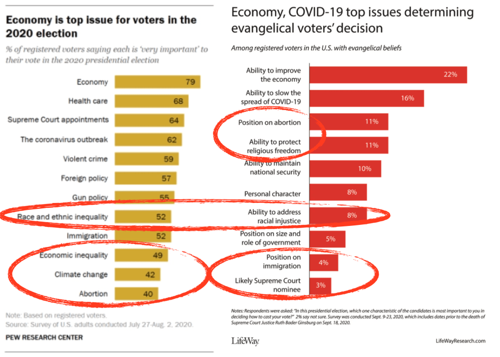Till vänster har vi en färsk undersökning om vilka frågor som amerikanska väljare i allmänhet prioriterar, och till höger en ännu färskare undersökning som fokuserar på evangelikala kristna (där vita är i majoritet). Ekonomin och sjukvård står högst upp för alla, men medan abort är lika lite prioriterad för allmänheten som klimatet så är det en av de viktigaste frågorna för evangelikala, liksom religionsfrihet. Orättvisor mellan vita och svarta har lägre intresse, och migrationsfrågor intresserar evangelikala knappt alls (för att inte tala om klimat som inte ens fanns med).
