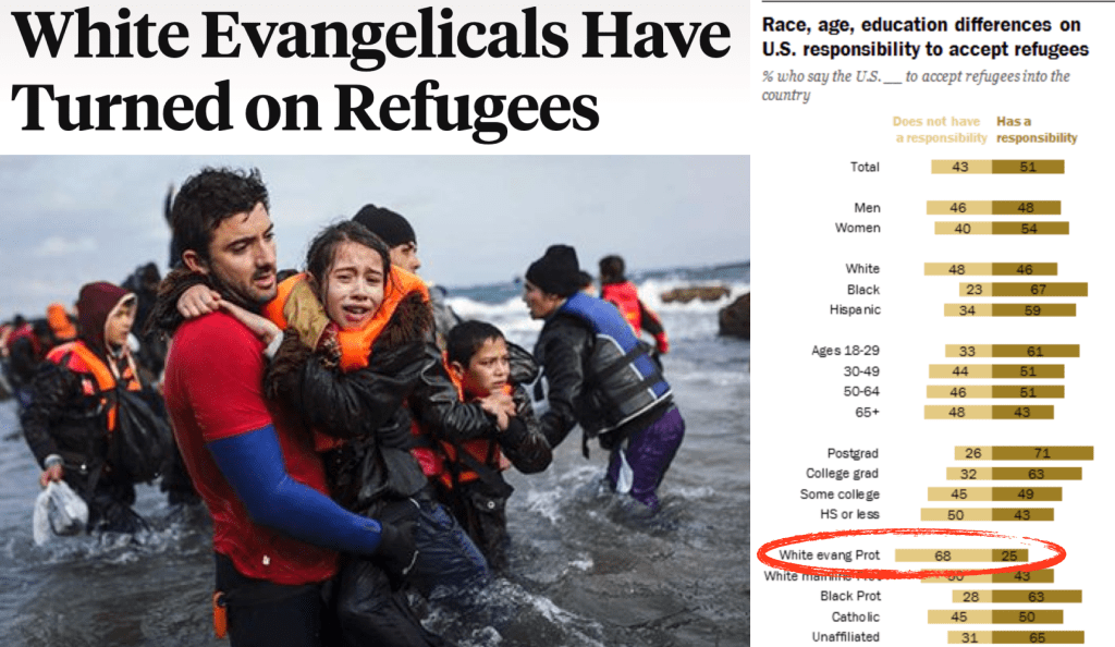 Hur det kan ha blivit så här när det finns över hundra bibelverser som betonar vikten av att välkomna invandrare och flyktingar och när USA som land är byggt på flyktinginvandring är ett mysterium för en annan dag. Vi vet dock att det inte är den evangelikala bibelsynen som är boven – svarta kristna är den grupp som i allra högsta grad stödjer att USA tar emot flyktingar. Vad som än har orsakat denna kalla inställning till asylmottagning är det inte konstigt att vita evangelikala sluter upp bakom Trumps motstånd mot att hjälpa flyktingar – något som kommer intensifieras om han blir omvald – och att de inte betraktar hjälp till flyktingar som en kristen värdering.