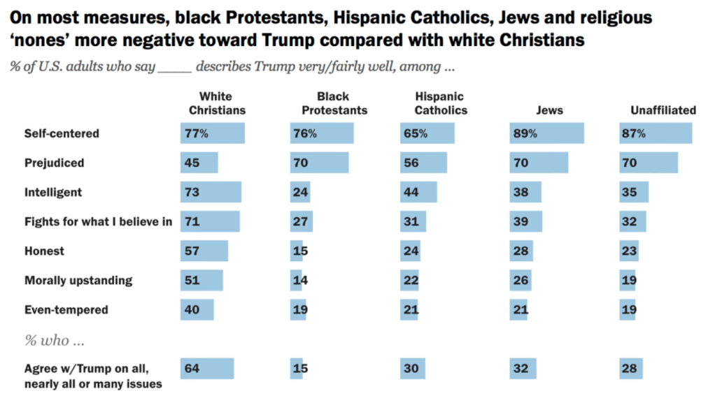 Svarta evangelika menar däremot inte att Trump är ett moraliskt föredöme, bland annat för att han är självcentrerad och fördomsfull. Intressant nog håller lika många vita evangelikala – 77 procent – med om att Trump är självcentrerad, men för de flesta är detta inte ett problem.