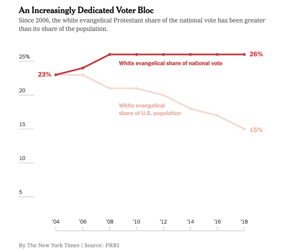 Slutligen har vi ovanstående statistik, som förbluffade mig rätt rejält när jag stötte på den. Jag nämnde ovan att den evangelikala rörelsen har svårt att få unga att stanna kvar eller ansluta sig. Faktum är att rörelsen befinner sig i fritt fall: på bara femton år har vita evangelikala gått från att omfatta en fjärdedel av USA:s befolkning till en sjättedel. Men notera att de har fortsatt vara en fjärdedel av väljarkåren. Hur gick det till?