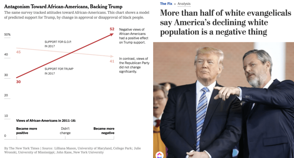 Vi kan se statistiskt att en ökad negativ attityd gentemot svarta korrellerar med att stödja Trump, och att en majoritet vita evangelikala ser en minskad vit befolkning som något negativt. Detta kan förklara varför de inte reagerar lika starkt på Trumps stöd från vitmaktrörelsen som sina svarta trossyskon.