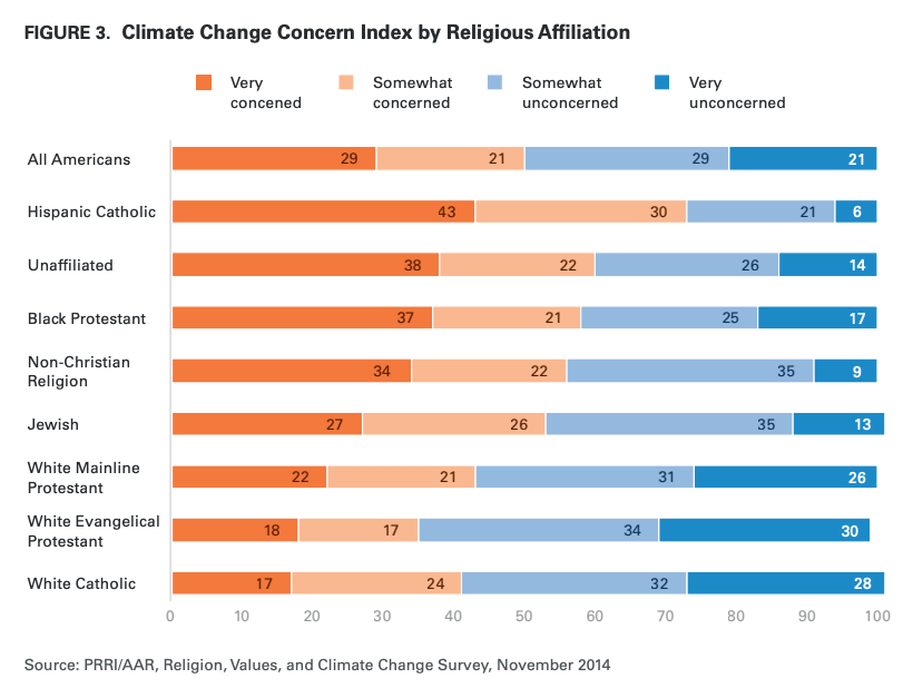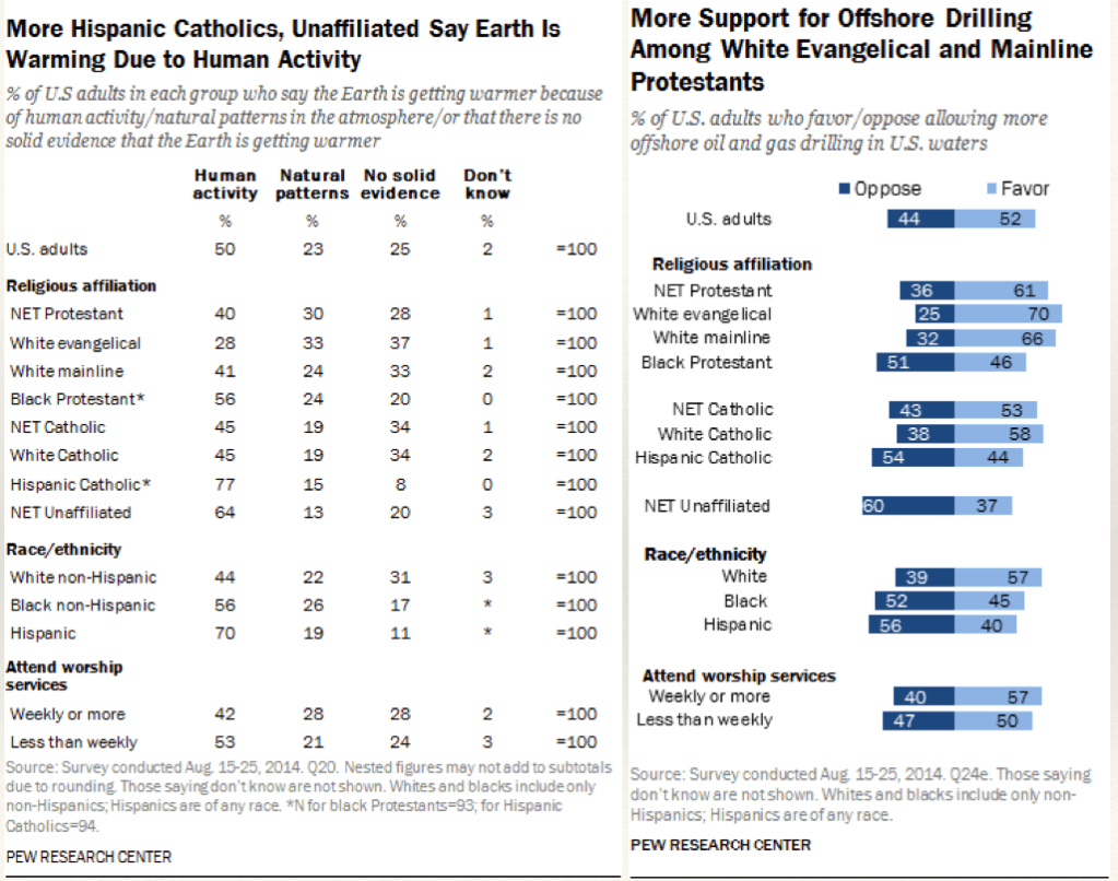 Allt färre förnekar klimatförändringarnas existens, men en grupp som är mer seglivad i sin skepticism är vita evangelikala. Enbart 28 procent av dem håller med om att jordens klimat blir varmare på grund av mänsklig aktivitet. Det beror knappast på deras bibelläsning då svarta evangelikala och spansktalande katoliker är eniga med forskningen och motsätter sig försök att skaffa fler fossila bränslen mer än den amerikanska befolkningen i genomsnitt. Vita evangelikalas förnekande av klimatvetenskapen hänger förmodligen samman med gruppens höga lojalitet till det republikanska partiet, där många politiker genom åren fört en sådan linje.