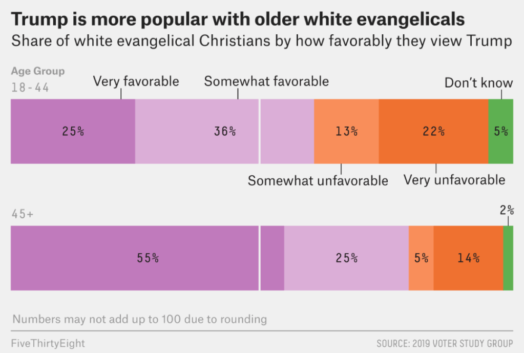 De vita evangelikala som stöder Trump är framför allt de över 45 år. Övertygelser från Kalla kriget såsom skräck för kommunism och idéer om amerikansk överlägsenhet kan därför spela in i valet av Trump, medan yngre evangelikala inte delar dessa övertygelser i lika stor utsträckning. USA:s evangelikala rörelse har överlag svårt att konvertera yngre människor, och de som väl ansluter sig ser inte en lika självklar koppling till att stödja Republikanerna som äldre vita evangelikala gör.