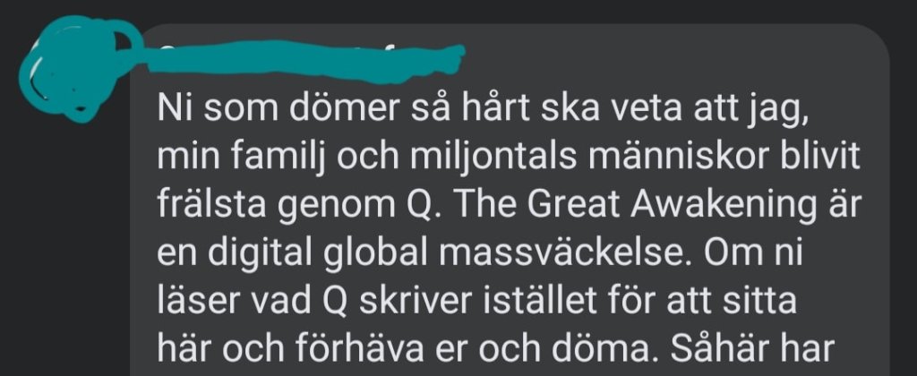 Om frågan vad som vaccinerar oss mot konspirationsteorier saknade jag att ni inte mer tydligt uttryckte Guds ord som det ”vaccinet”. Jag uppskattar att ni talar om att med ödmjukhet möta människor som befinner sej i sekteristiska miljöer och som egentligen inte förstår varför man hamnat där o.s.v men det får samtidigt inte bli ”utan salt” när man tillrättavisar. Gällande människor i USA har de flesta tillgång till en bibel, åtminstone om man vill kallas evangelikal kristen, och då behöver man inte bläddra många sekunder i bibeln för att finna ett bibelord som avslöjar att man halkat snett om man tror på något som QUanon. Bönen blir ju utöver ”din är makten” att be för varandras kärlek till Guds ord – sanningen. Hinner man inte eller har annat som står i vägen på morgonen så stoppar man iaf i sej en snabbmacka och nåt drickbart. Några bibelverser varje morgon eller kväll avslöjar som sagt direkt det falska. Man behöver inte bli ”expert” på texterna. Man behöver bara tillräckligt, avseende vaccinering mot det konspiratoriska, för att veta när man direkt kan kasta något i soptunnan. Med den ökade digitaliseringen och snabba spridningen av budskap får vi nog se det som en ny rutin. Typ: ”Nu läser jag iaf tre bibelord som vaccinering mot dagens falska budskap.” Då summan av Guds ord är sanning så räcker det med att man ser att budskapet inte stämmer med “summan”. Man behöver inte gå in på detaljerna i så fall. Sedan är det i fallet QUanon så uppenbart antikristligt alltihop att man undrar verkligen hur människor låter sej luras av det, men vem vet, om man självt växt upp i de miljöerna under vissa omständigheter kanske man halkat in på det på nåt sätt. Men även då hade ju som sagt bibeln lätt hjälpt om man satt den högre än människors ord. Det handlar om var man lägger makten.