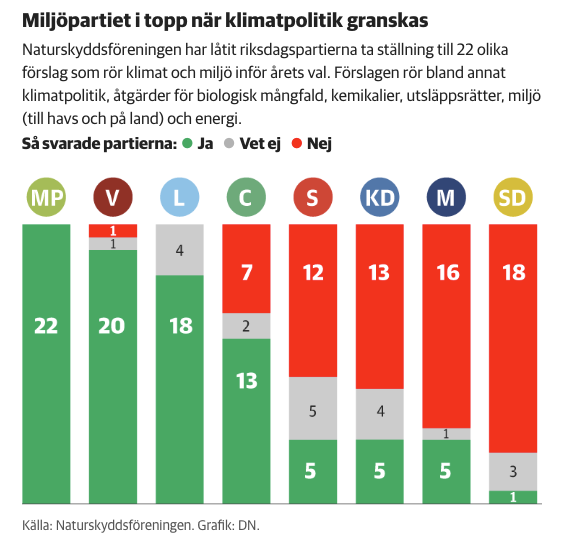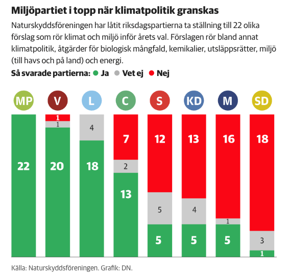 Hur går det här ens till? DN skriver att flera svenska partiers klimatambitioner har sänkts sen förra valet. Miljöpolitiken hos de stora partierna S och M rankas som svag och i botten ligger SD. 🤦♂️