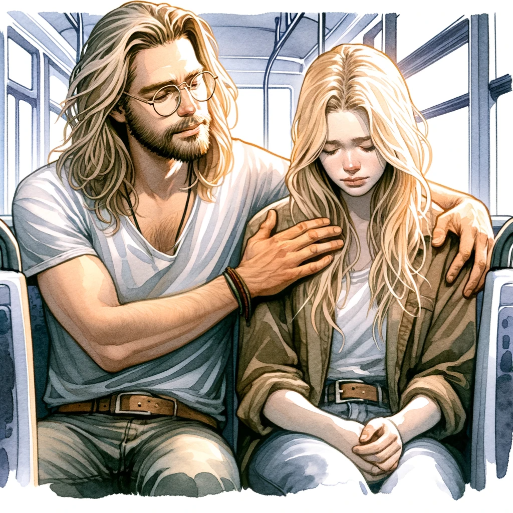 Hon satt på ett sidosäte som verkade förvärra yrseln så jag erbjöd henne min plats istället. Jag frågade vart hon var på väg och om det var någon som mötte upp henne. Hon tackade för omsorgen, sa att hon var på väg till en kompis och förklarade att hon led av en extrem variant av migrän som heter hortons huvudvärk sedan sju år tillbaka.