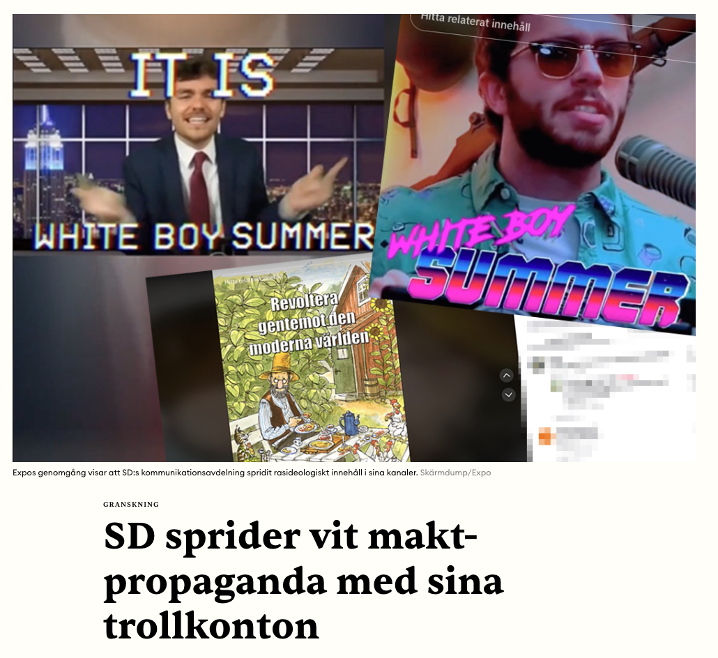 Det är de som avgör vad som är hippt och töntigt, inne och ute. Det hade kunnat vara aningen skrattretande om det var faktiska högstadiekillar som i sin grabbighet satt och pumpade ut rassiga memes, för att vara häftiga. Nu fastnar skrattet i halsen. Det här är ett folkvalt partis kommunikationsavdelning, illa dold av en anständig fasad.