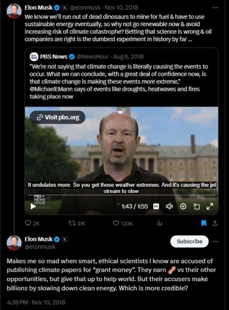 För sex år sen förespråkade Musk att ersätta fossila bränslen med förnybar energi ”nu” och tog klimatforskare som Michael Mann i försvar då han mycket riktigt påpekade att satsa på att forskarna har fel och oljebolagen har rätt är ”det dummaste experimentet i världshistorien”.
