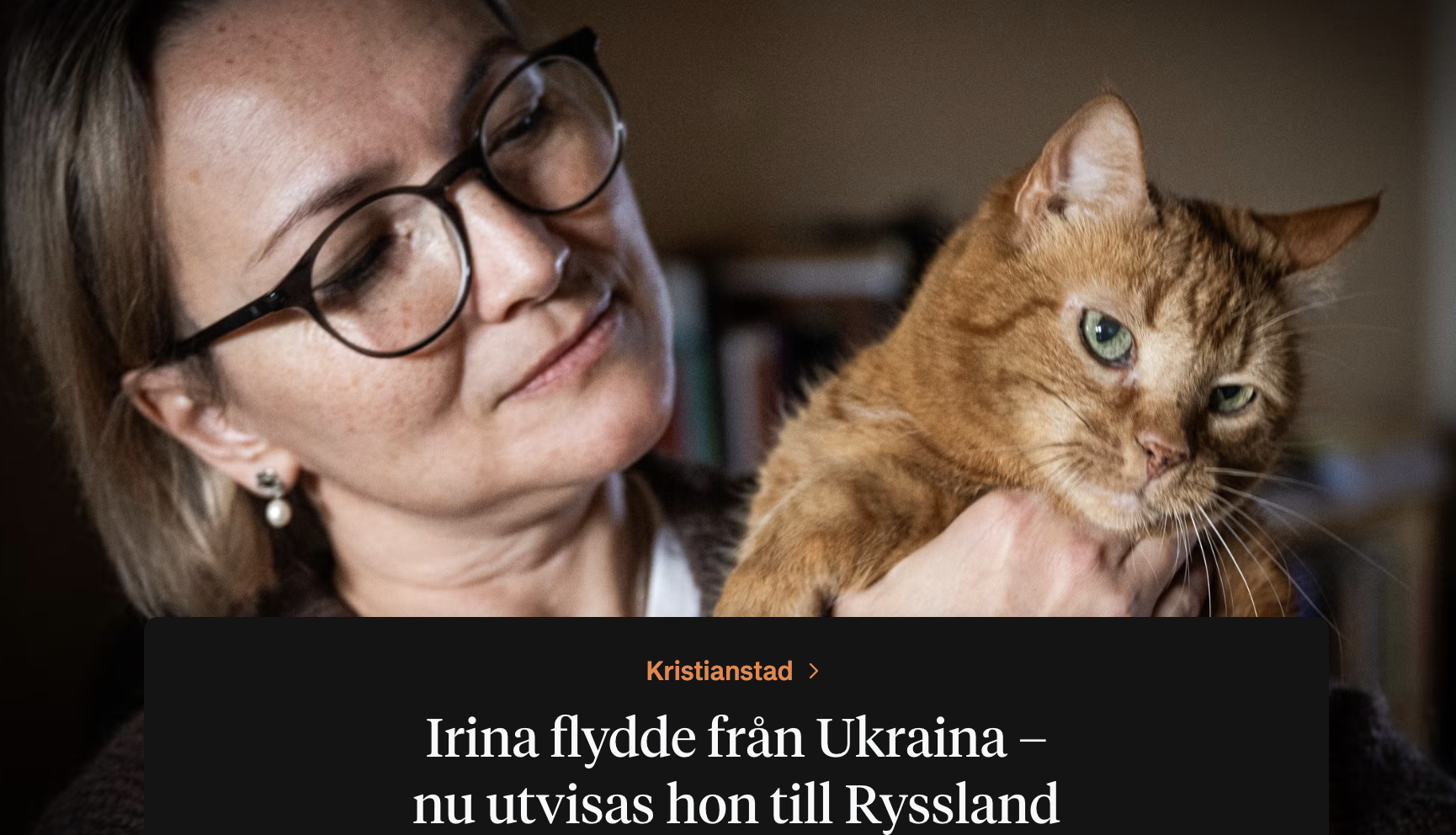 Men så var inte fallet. Den ”strama” migrationspolitiken har gjort att nästan bara tillfälliga uppehållstillstånd ges numera istället för permanenta, och de måste förnyas. Men inte i Sverige, utan i hemlandet. Vilket för Irina tydligen är Ryssland, trots att hon inte har bott där på 14 år och trots att hon stöttat Ukraina under kriget.